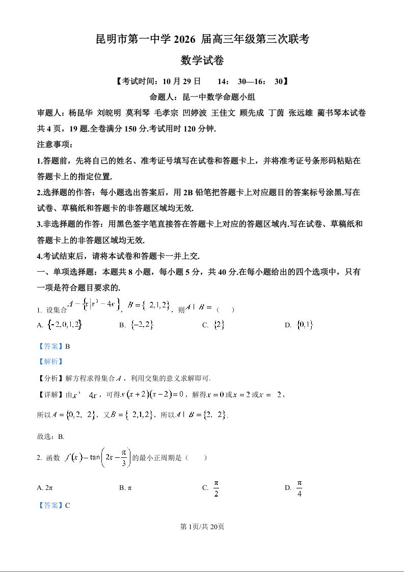 高三数学(精品解析版)--云南省昆明市第一中学2026届高三上学期第三次联考