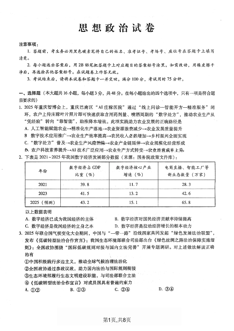 高三政治--重庆市巴蜀中学2026届高考适应性月考卷(三)