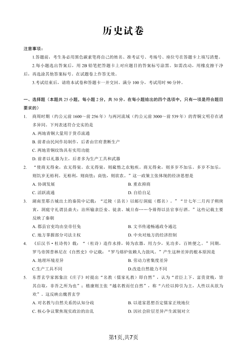 高三历史--重庆市巴蜀中学2026届高考适应性月考卷(三)