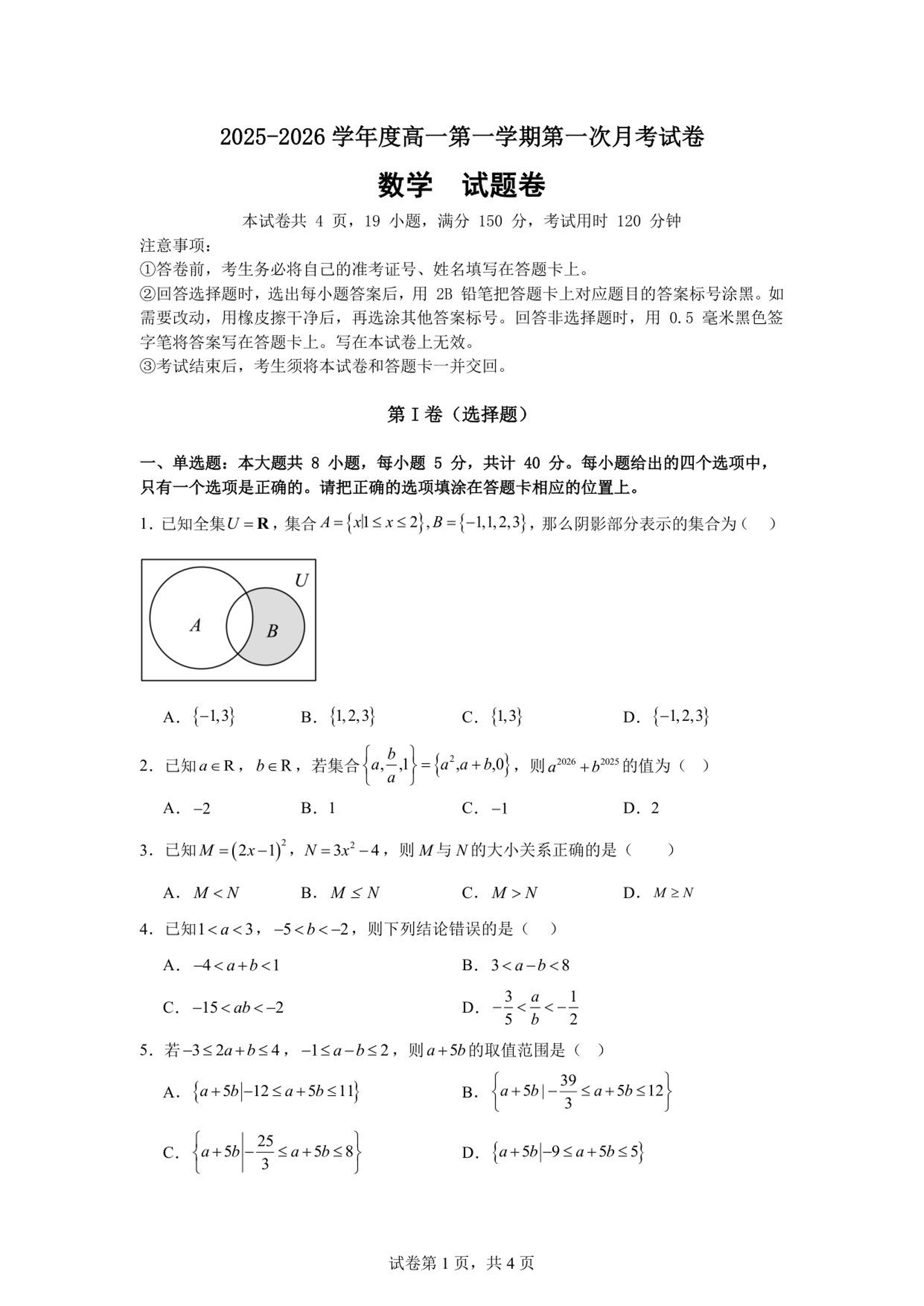 高一数学+答案--安徽省六安市独山中学2025-2026学年高一上学期10月月考