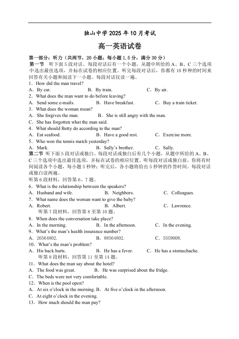 高一英语--安徽省六安市独山中学2025-2026学年高一上学期10月月考