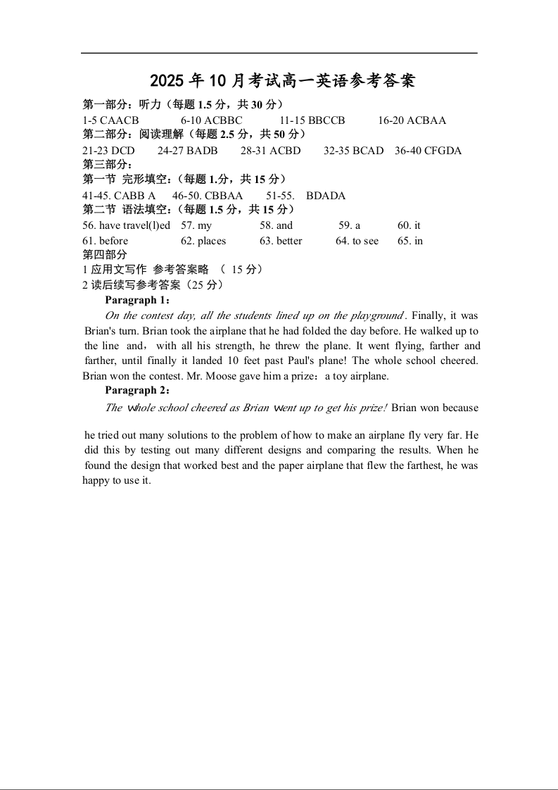 高一英语答案--安徽省六安市独山中学2025-2026学年高一上学期10月月考