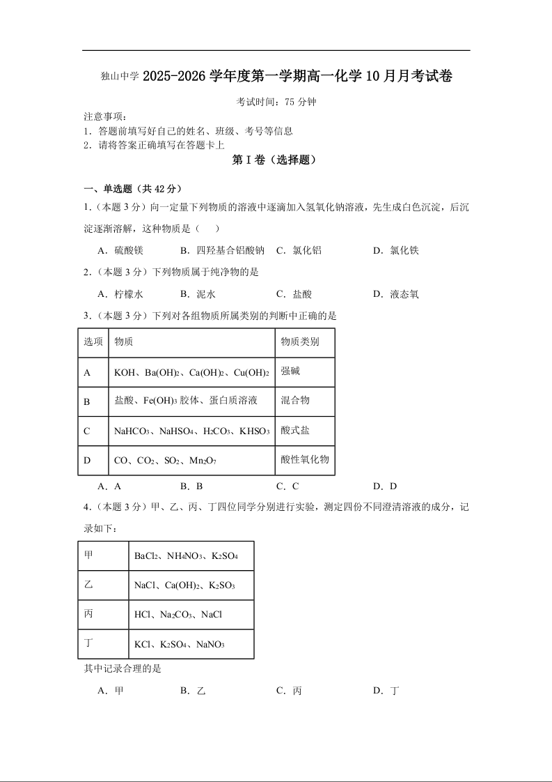 高一化学+答案--安徽省六安市独山中学2025-2026学年高一上学期10月月考