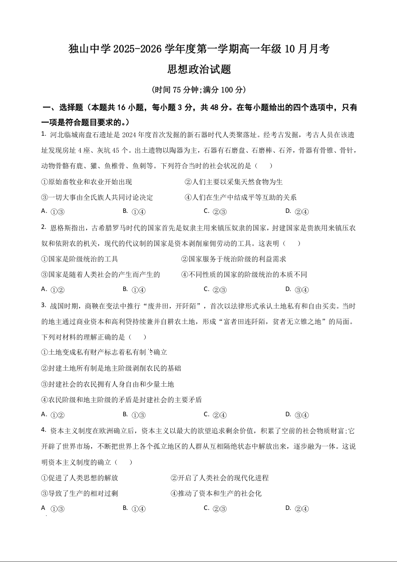 高一政治+答案--安徽省六安市独山中学2025-2026学年高一上学期10月月考