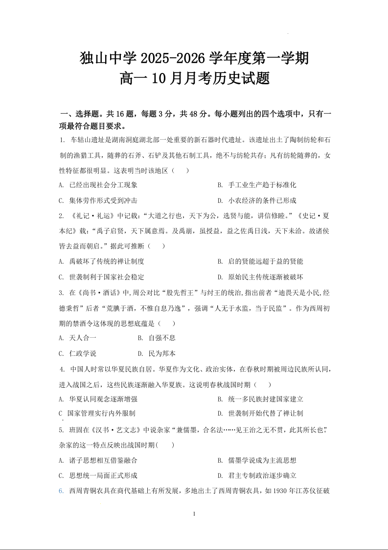 高一历史+答案--安徽省六安市独山中学2025-2026学年高一上学期10月月考