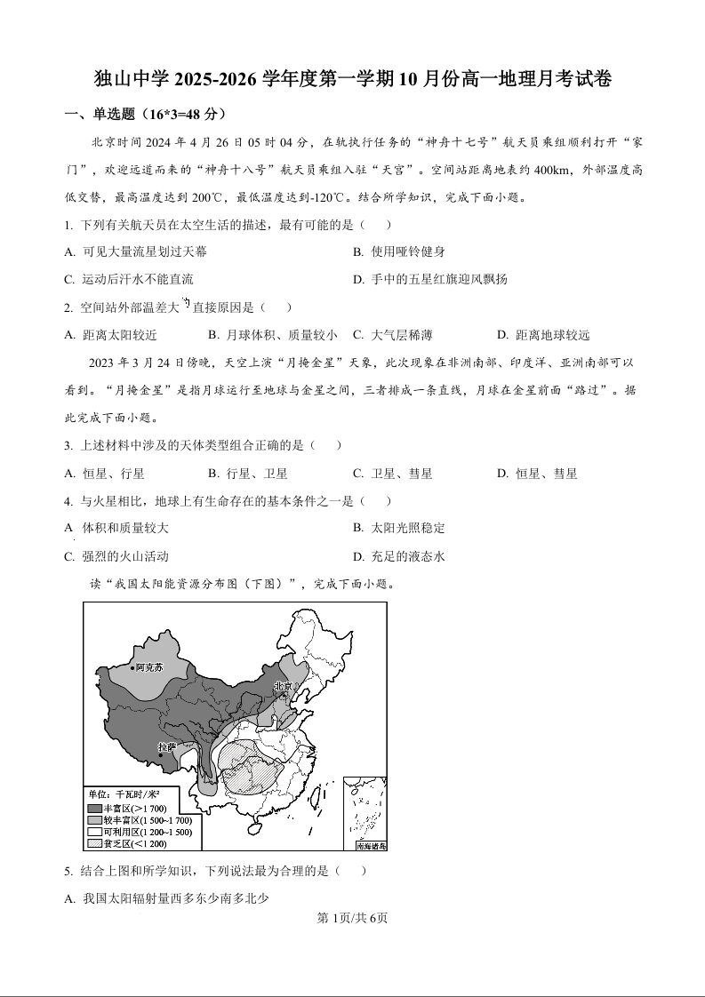 高一地理(原卷版)--安徽省六安市独山中学2025-2026学年高一上学期10月月考