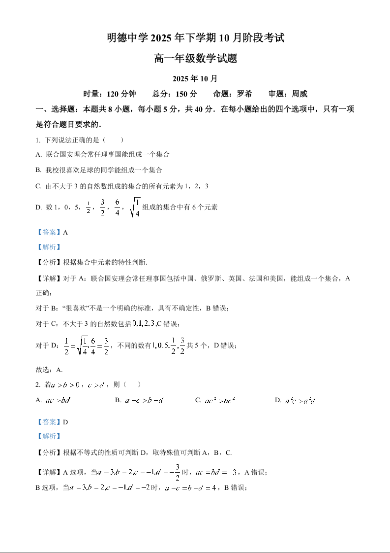 高一数学(解析版)--湖南省长沙市明德中学2025-2026学年高一上学期10月月考