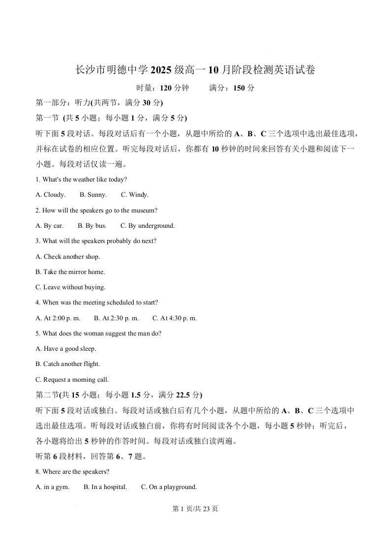 高一英语(解析版)--湖南省长沙市明德中学2025-2026学年高一上学期10月月考