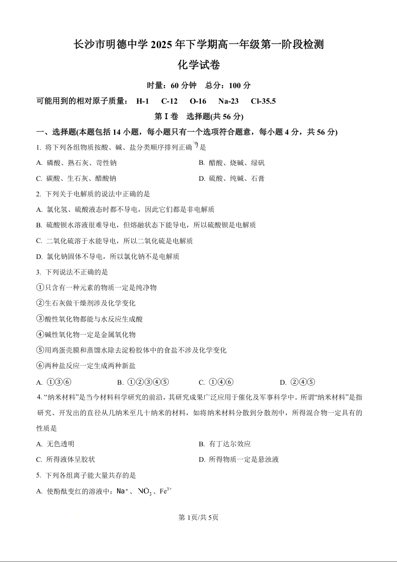 高一化学(原卷版)--湖南省长沙市明德中学2025-2026学年高一上学期10月月考