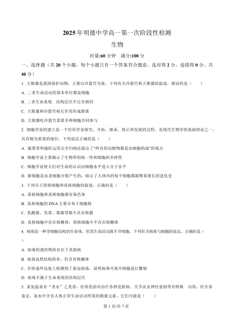 高一生物(原卷版)--湖南省长沙市明德中学2025-2026学年高一上学期10月月考