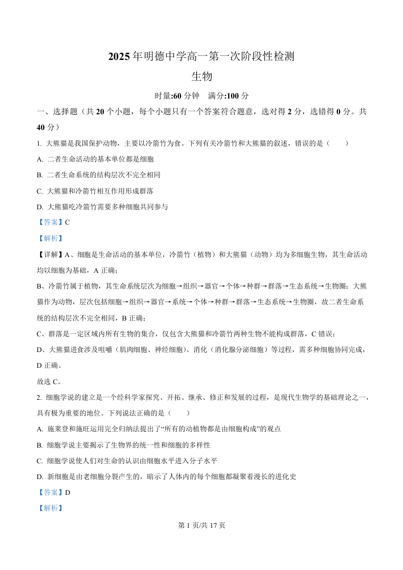 高一生物(解析版)--湖南省长沙市明德中学2025-2026学年高一上学期10月月考