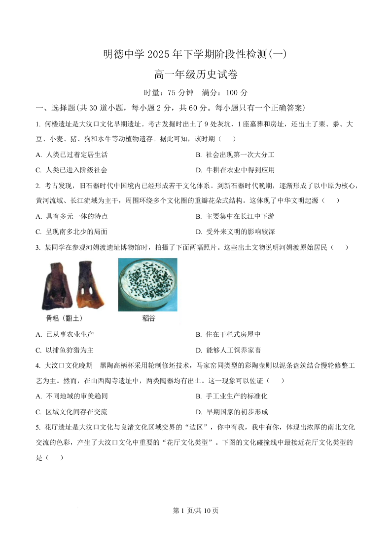 高一历史(原卷版)--湖南省长沙市明德中学2025-2026学年高一上学期10月月考