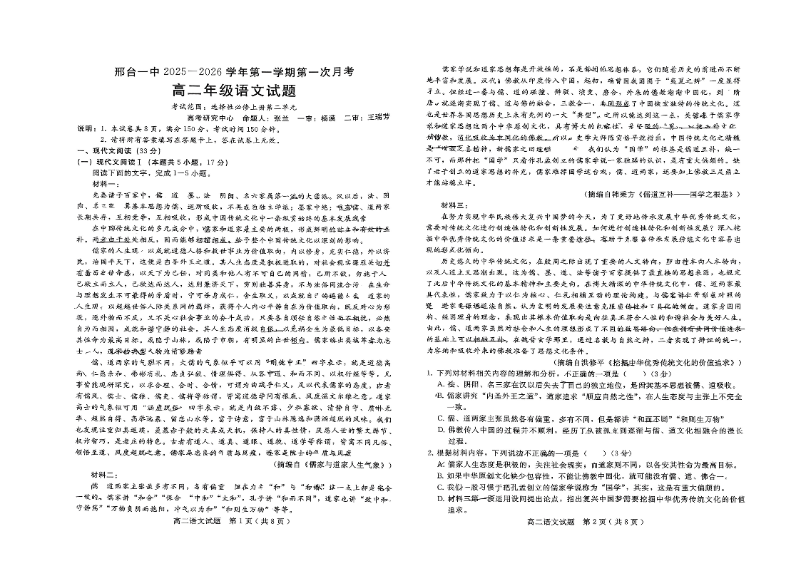 高二语文+答案--河北省邢台市第一中学2025-2026学年高二上学期10月第一次月考