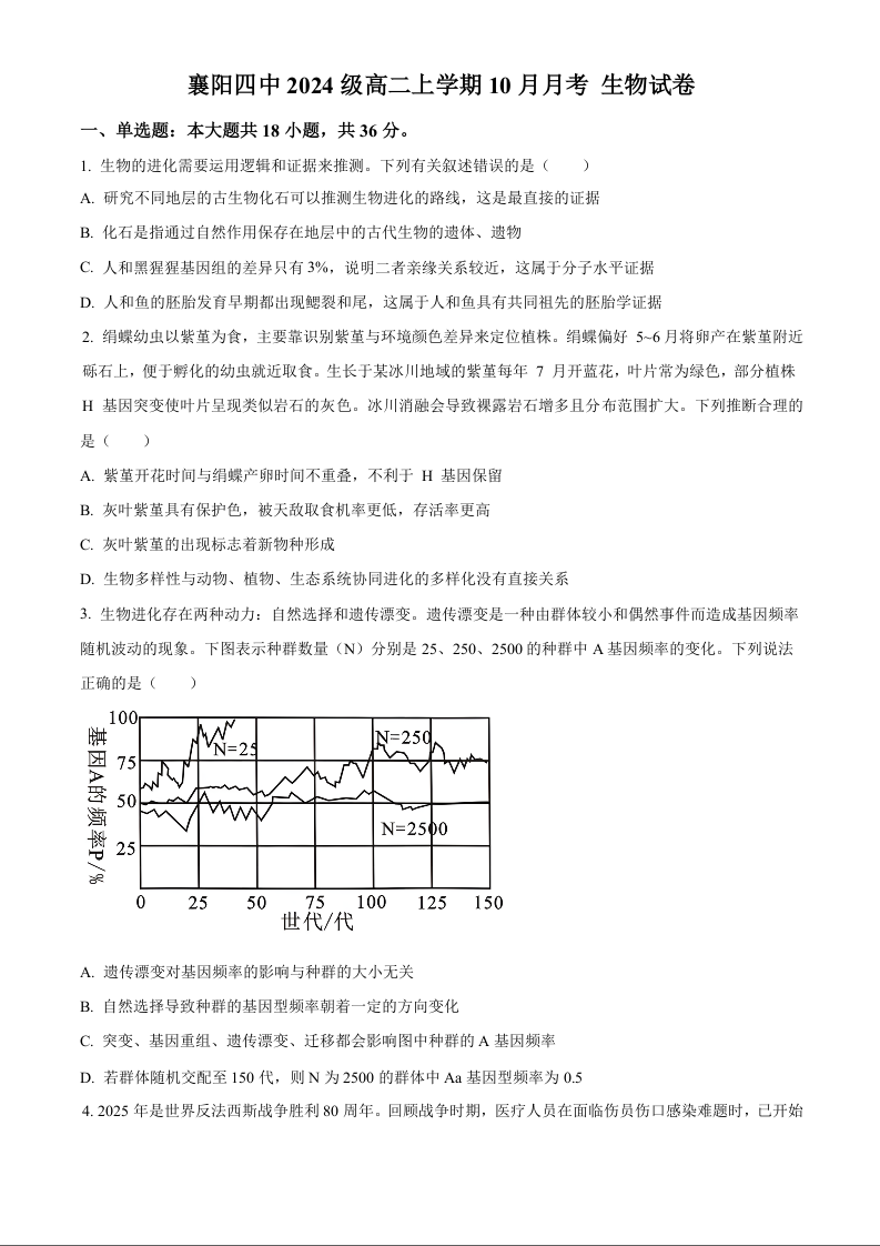 高二生物(原卷版)--湖北省襄阳市第四中学2025-2026学年高二上学期10月月考