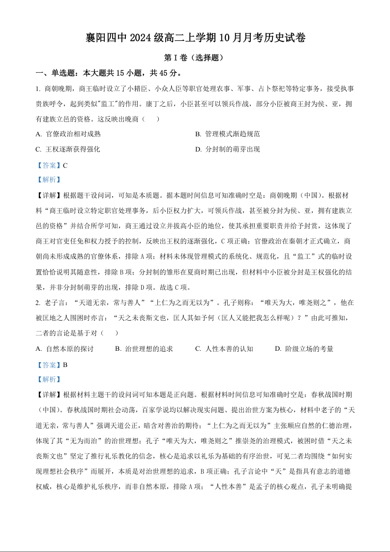 高二历史(解析版)--湖北省襄阳市第四中学2025-2026学年高二上学期10月月考