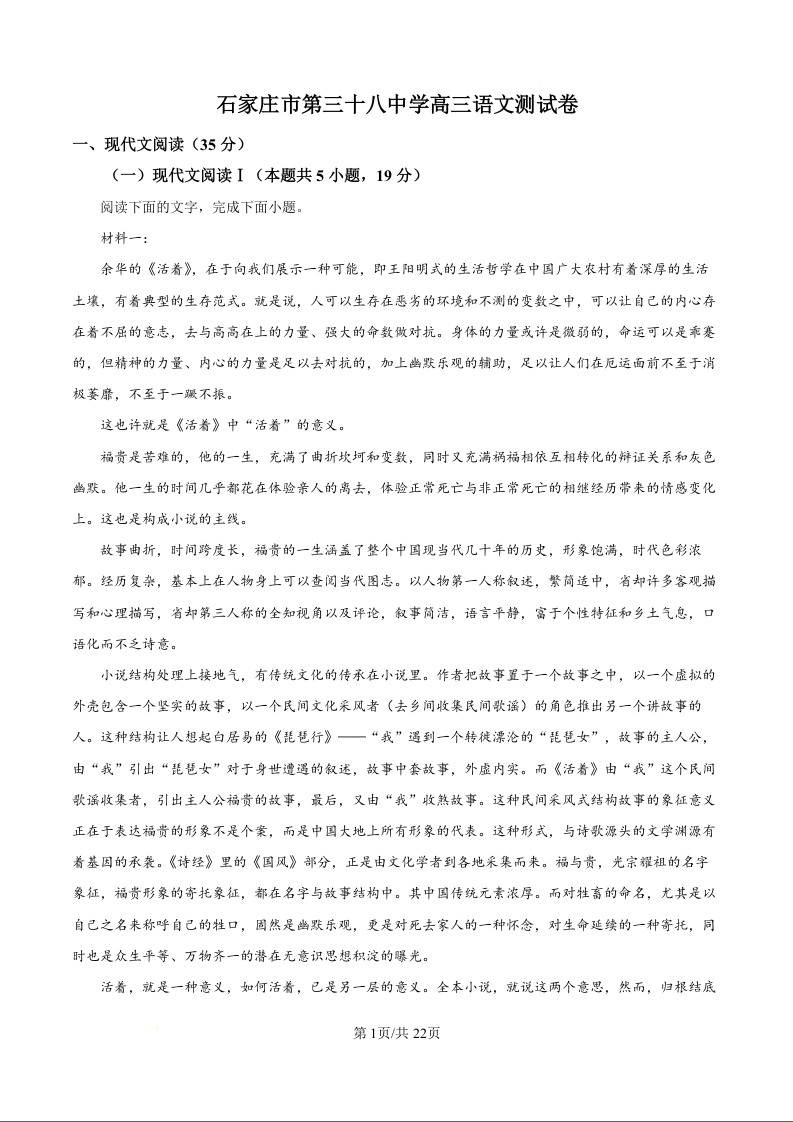 高三语文(精品解析版)--河北省石家庄市第三十八中学2026届高三上学期10月月考