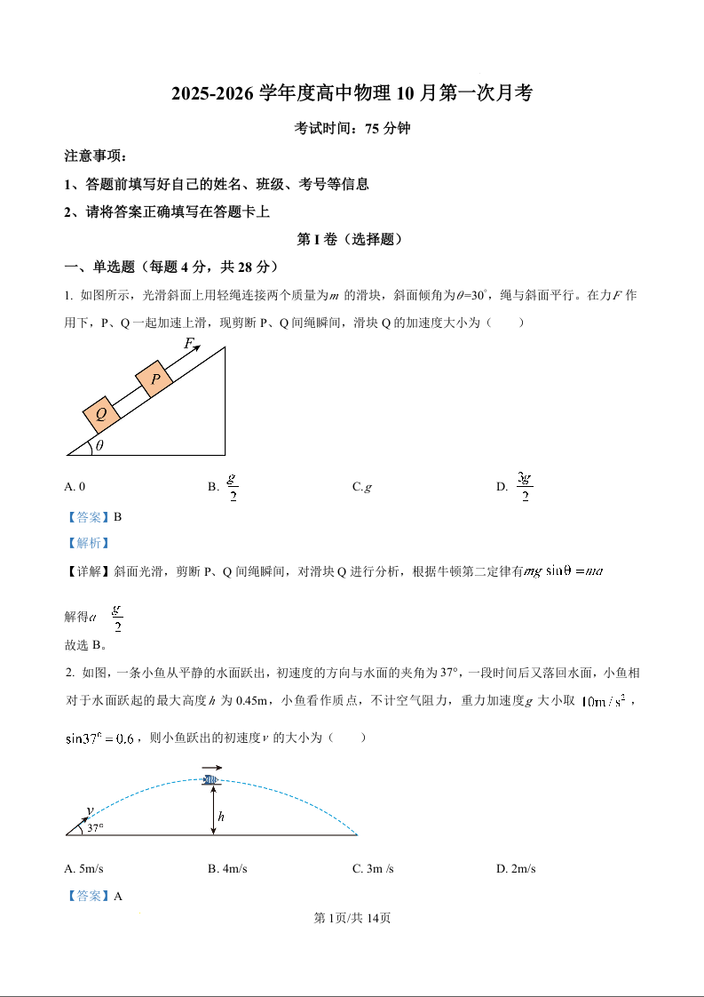 高三物理(精品解析版)--河北省石家庄市第三十八中学2026届高三上学期10月月考