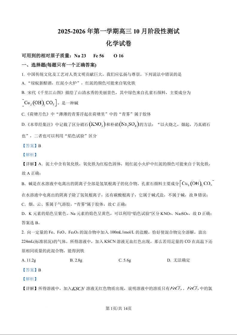 高三化学(精品解析版)--河北省石家庄市第三十八中学2026届高三上学期10月月考