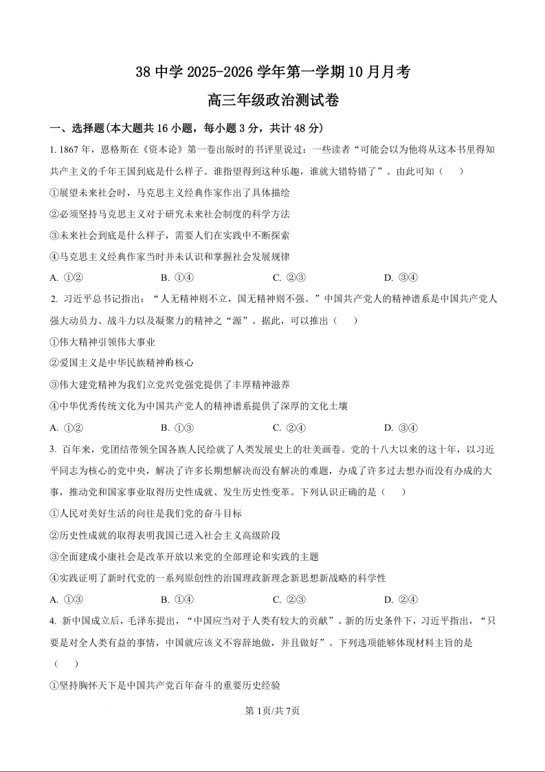高三政治(原卷版)--河北省石家庄市第三十八中学2026届高三上学期10月月考