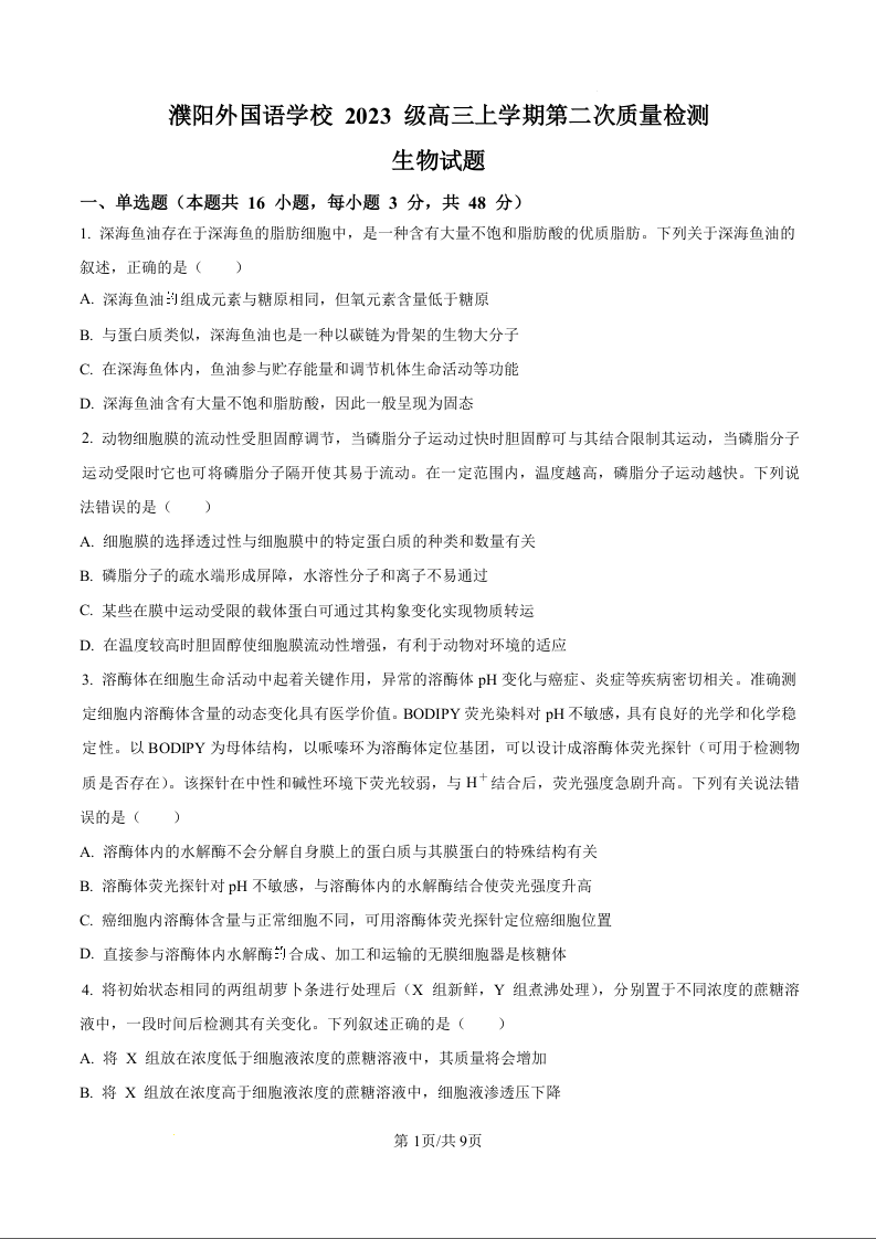 高三生物(原卷版)--河南省濮阳市外国语学校2026届高三上学期10月月考