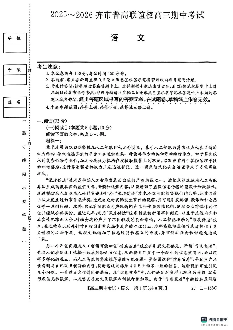 高三语文--黑龙江省齐齐哈尔市普通高中联谊学校2026届高三上学期期中考试