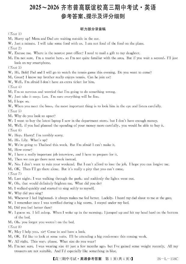 高三英语答案--黑龙江省齐齐哈尔市普通高中联谊学校2026届高三上学期期中考试