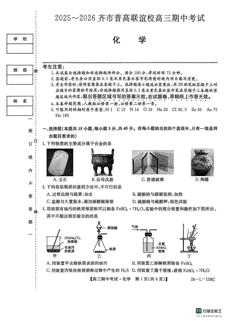 高三化学--黑龙江省齐齐哈尔市普通高中联谊学校2026届高三上学期期中考试