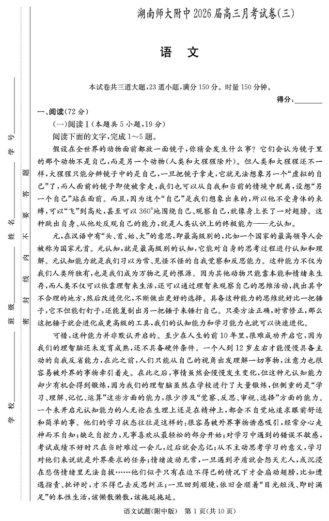 高三语文--湖南师范大学附属中学2026届高三上学期月考(三)