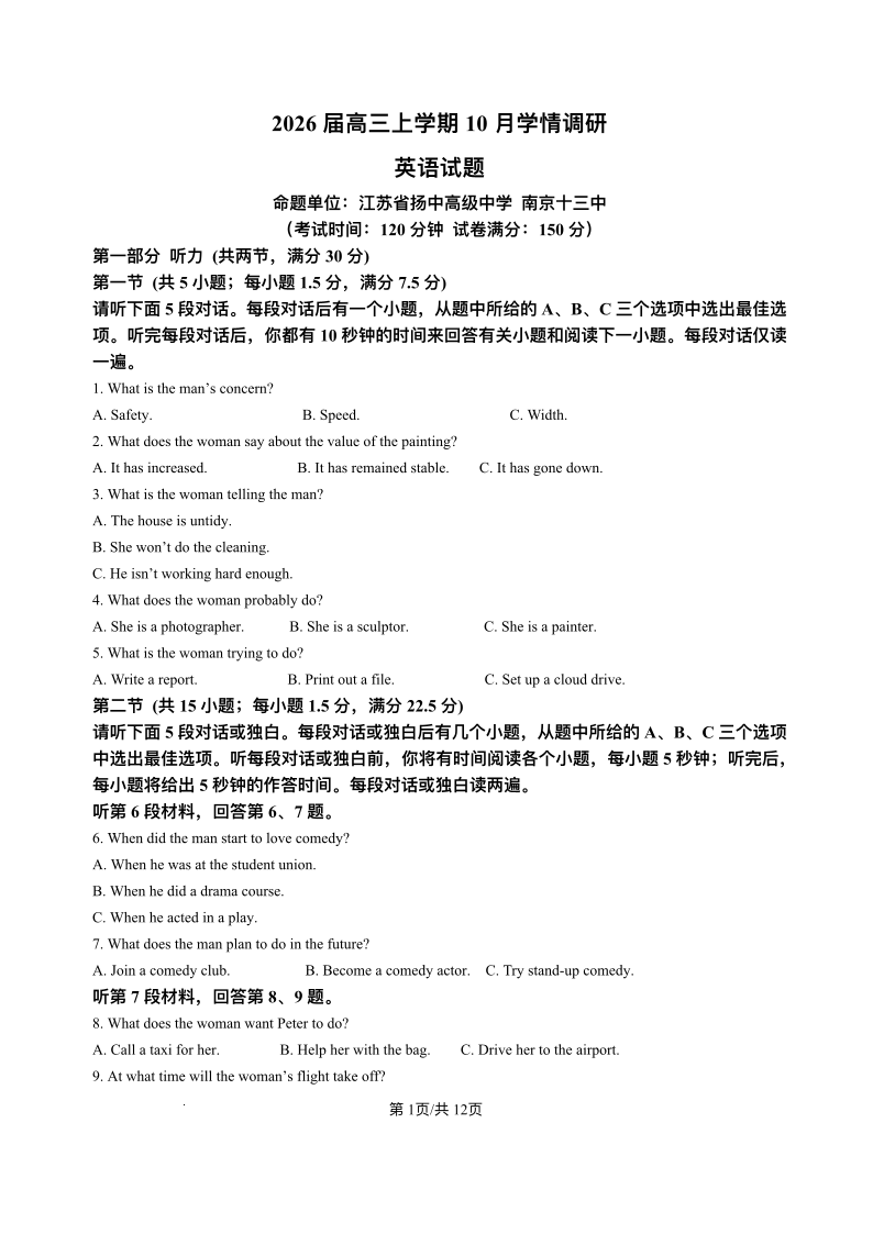 高三英语+答案--江苏省南京市、镇江市、徐州市联盟校2026届高三上学期10月学情调研