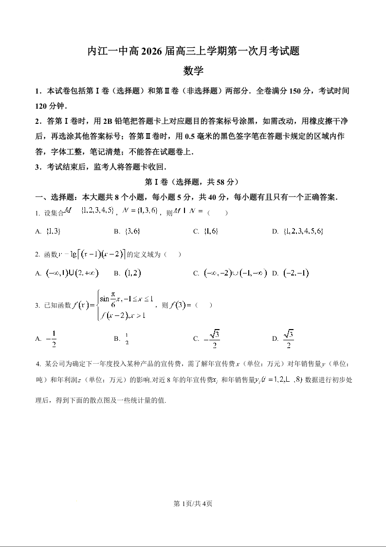 高三数学(原卷版)--四川省内江市第一中学2026届高三上学期第一次月考