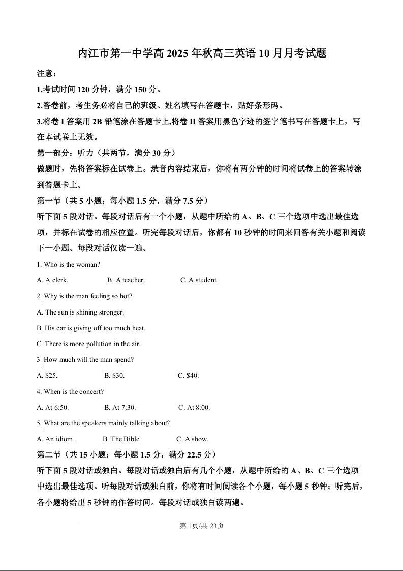 高三英语(精品解析版)--四川省内江市第一中学2026届高三上学期第一次月考