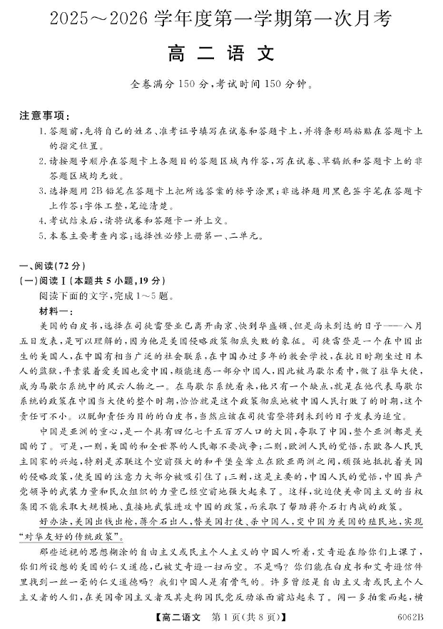 高二语文+答案--甘肃省多校2025-2026学年高二上学期第一次月考试题