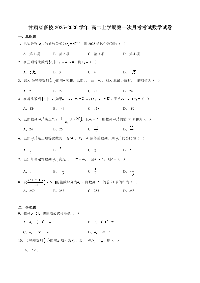 高二数学+答案--甘肃省多校2025-2026学年高二上学期第一次月考试题