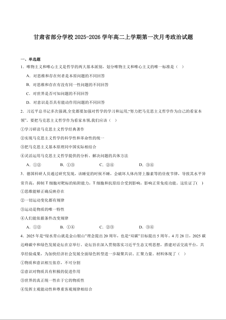 高二政治+答案--甘肃省多校2025-2026学年高二上学期第一次月考试题