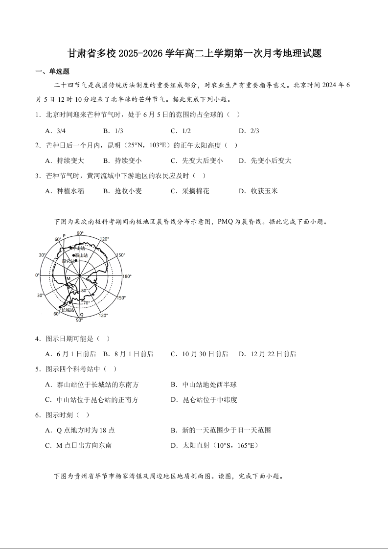 高二地理+答案--甘肃省多校2025-2026学年高二上学期第一次月考试题