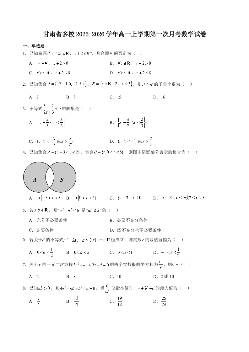 高一数学+答案--甘肃省多校2025-2026学年高一上学期第一次月考试题