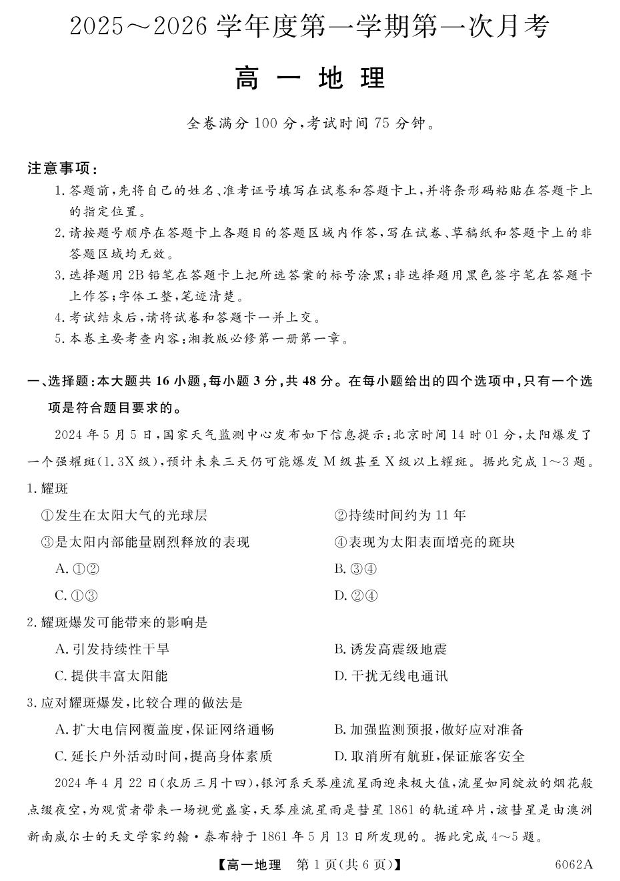 高一地理+答案--甘肃省多校2025-2026学年高一上学期第一次月考试题