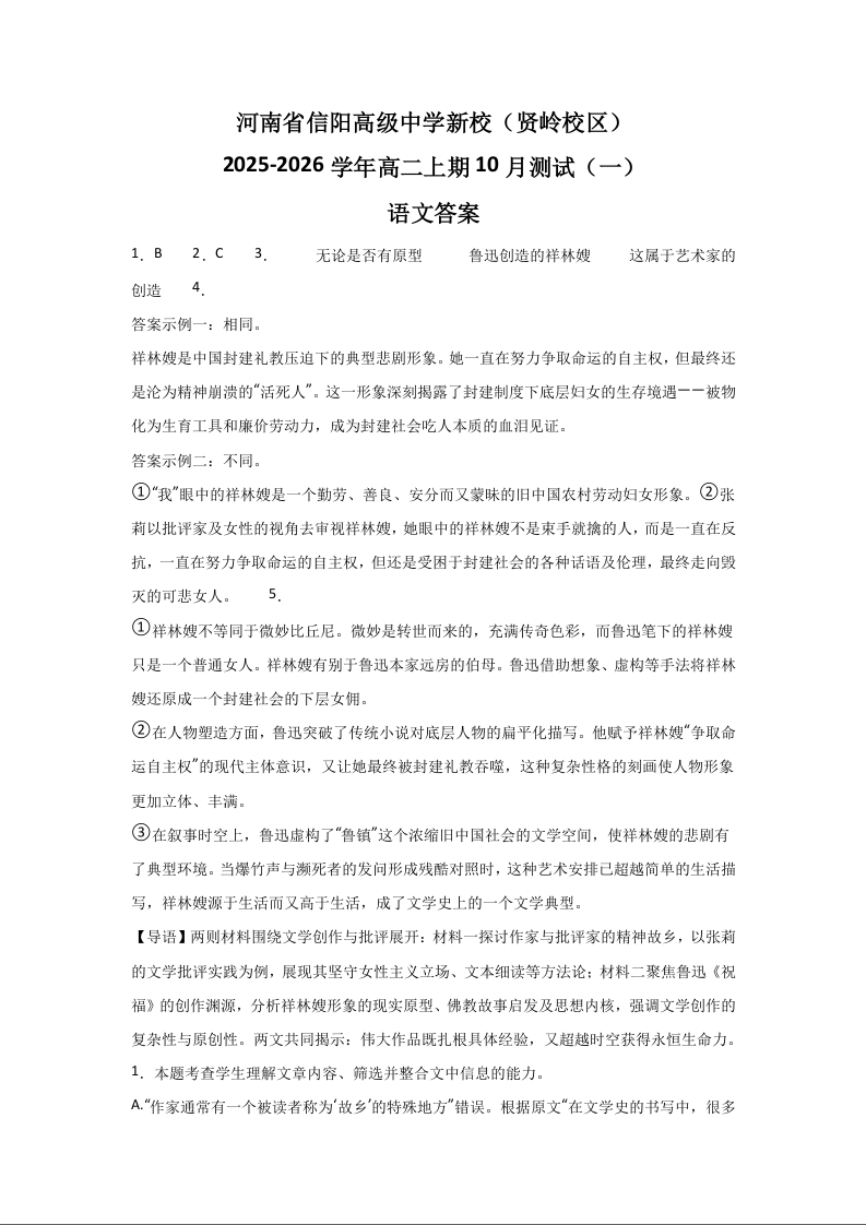 高二语文答案--河南省信阳市浉河区信阳高级中学2025-2026学年高二上学期10月月考