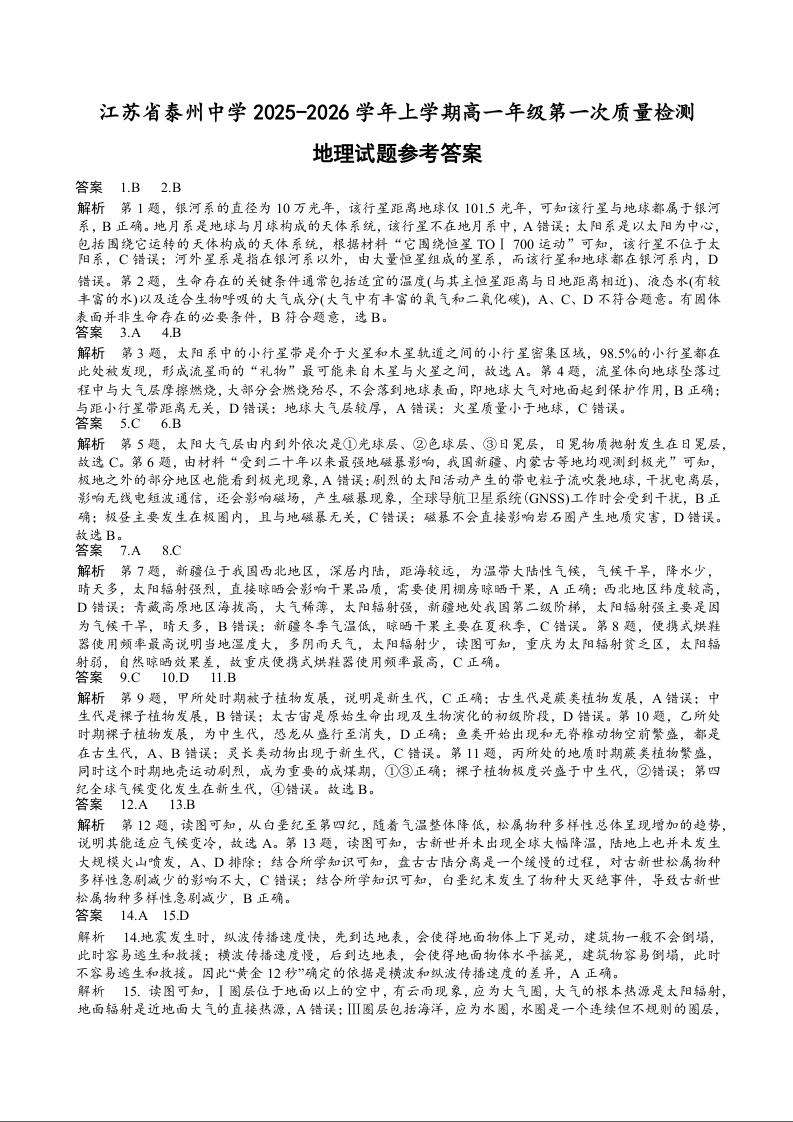 高一地理答案--江苏省泰州中学2025-2026学年高一上学期第一次质量检测