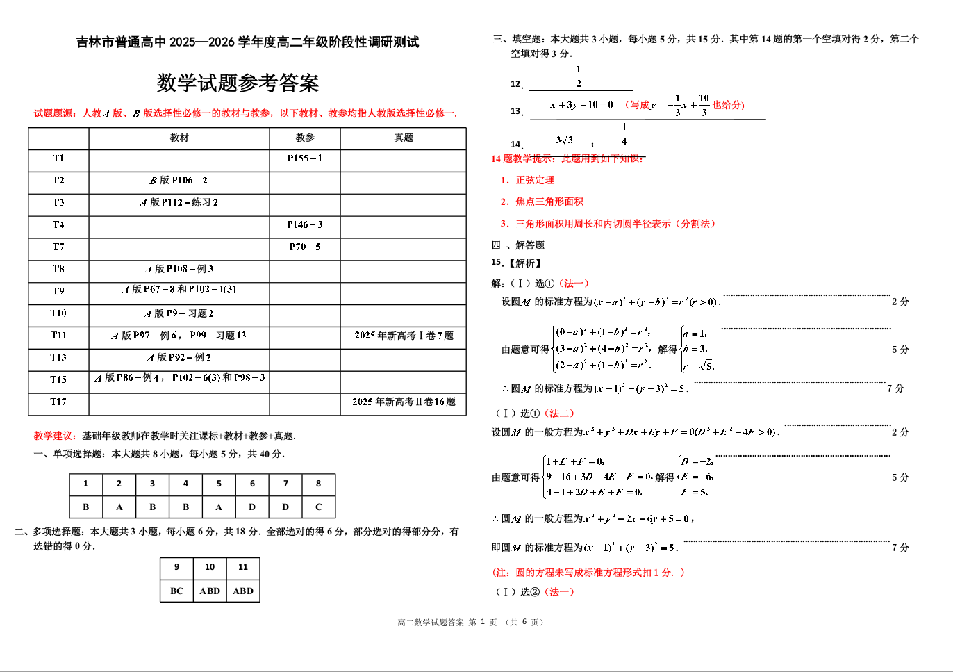 高二数学答案--吉林省吉林市普通高中2025-2026学年高二上学期期中考试