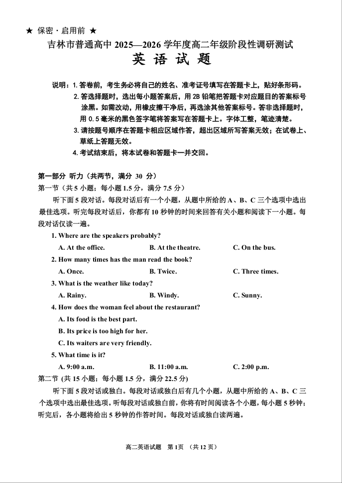 高二英语--吉林省吉林市普通高中2025-2026学年高二上学期期中考试