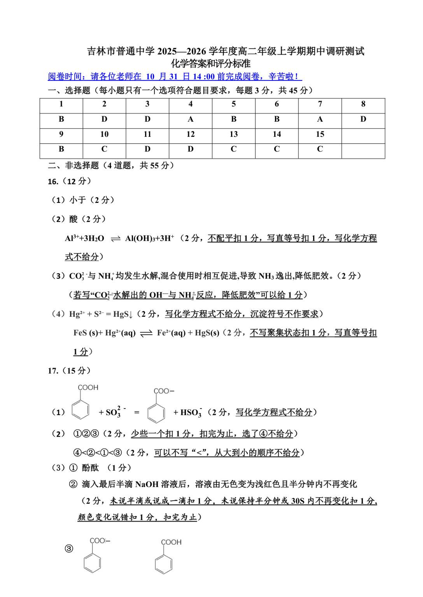 高二化学答案--吉林省吉林市普通高中2025-2026学年高二上学期期中考试