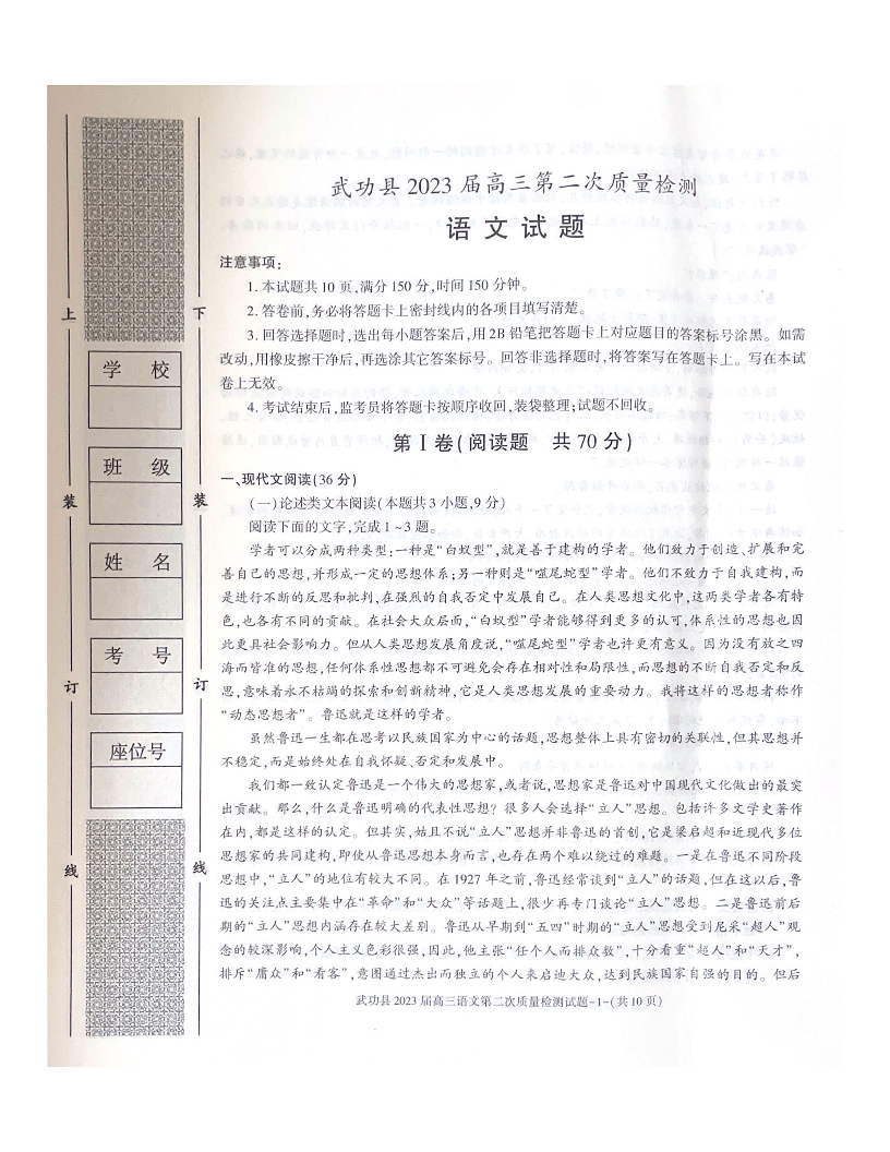 高三语文--陕西省咸阳市武功县2022-2023学年高三上学期第二次质量检测