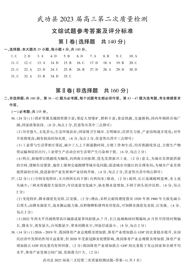 高三文综答案--陕西省咸阳市武功县2022-2023学年高三上学期第二次质量检测