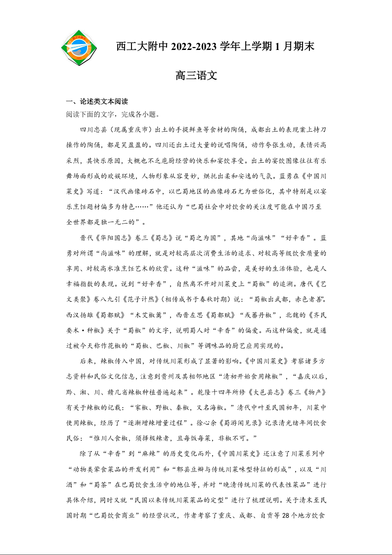 高三语文+答案--陕西省西安市西北工业大学附属中学高三上学期1月期末考试
