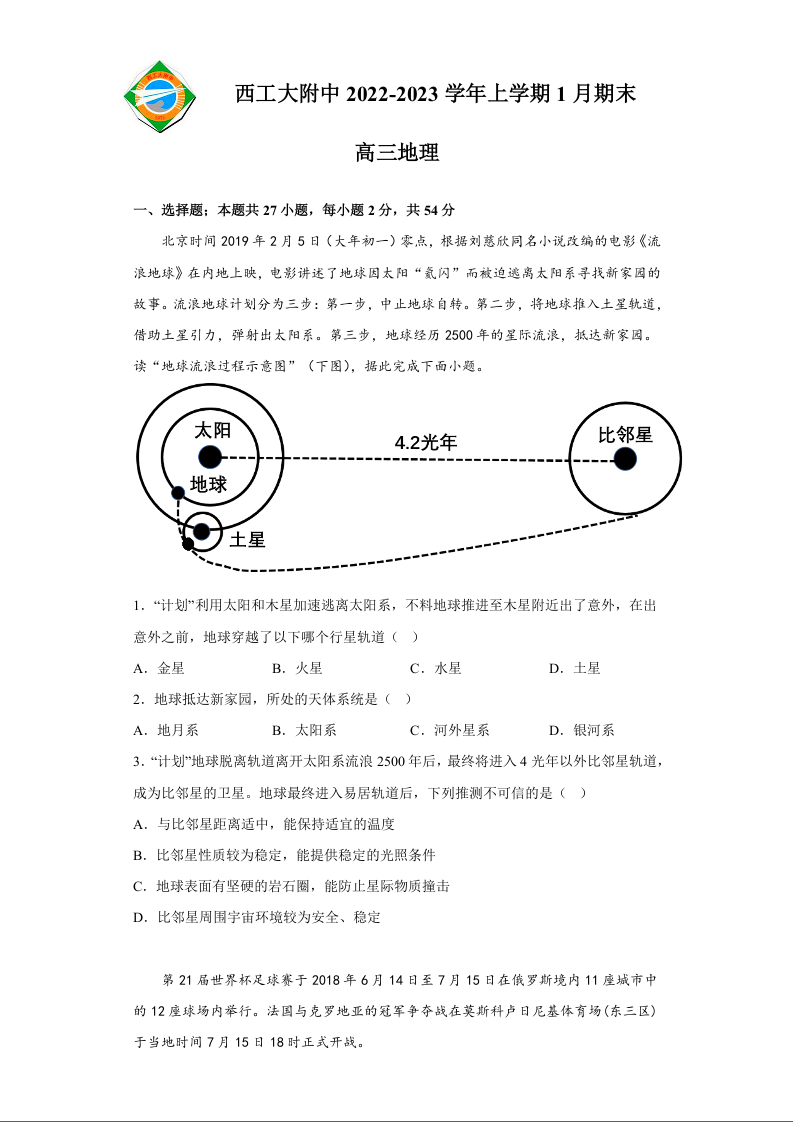 高三地理+答案--陕西省西安市西北工业大学附属中学高三上学期1月期末考试