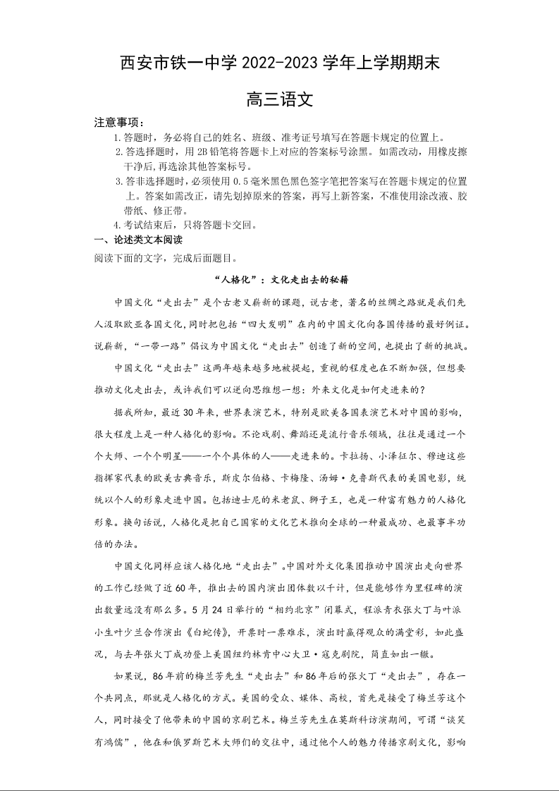 高三语文+答案--陕西省西安市铁一中学2022-2023学年高三上学期期末考试