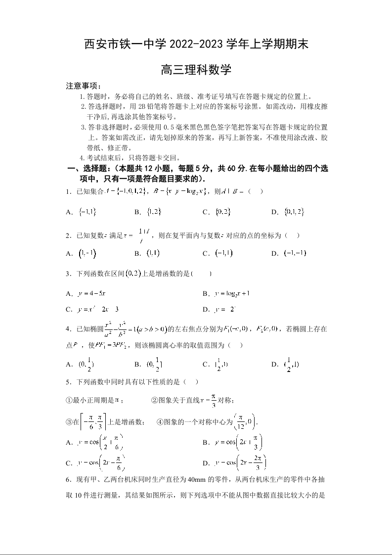 高三理科数学+答案--陕西省西安市铁一中学2022-2023学年高三上学期期末考试