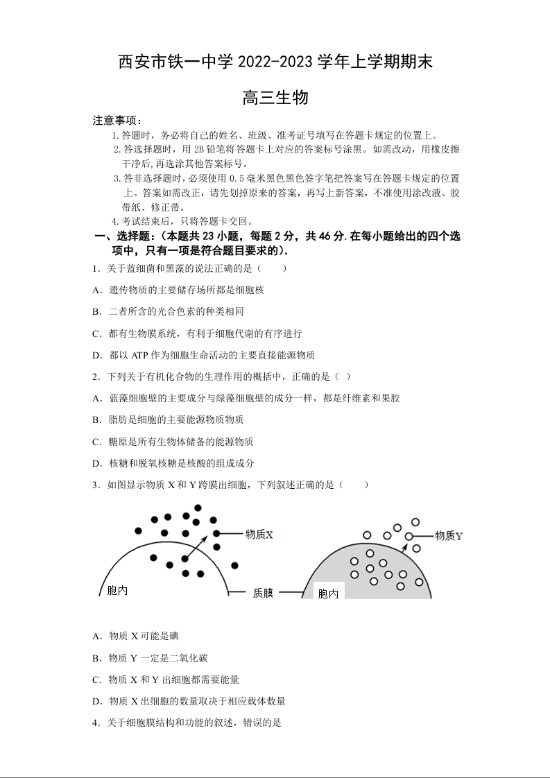 高三生物+答案--陕西省西安市铁一中学2022-2023学年高三上学期期末考试