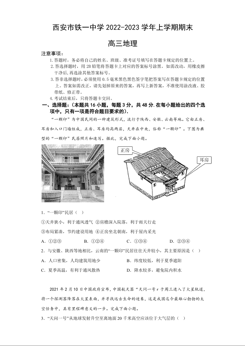高三地理+答案--陕西省西安市铁一中学2022-2023学年高三上学期期末考试